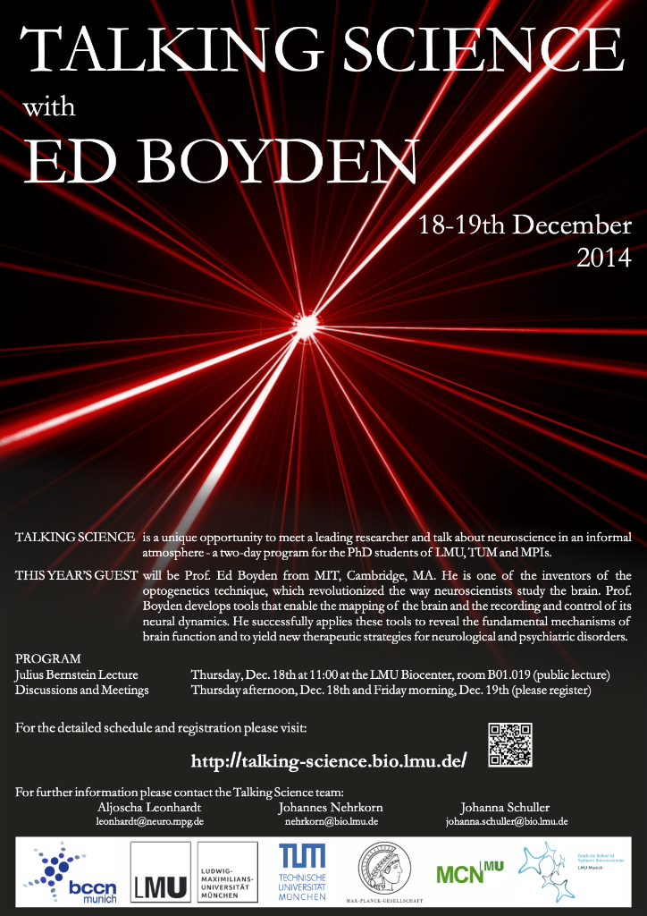 Talking Science is a two-day program for the graduate students of LMU, TUM, and MPIs in Munich, intended to give a unique chance to meet and discuss science with a leading researcher in an informal atmosphere.